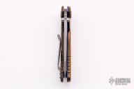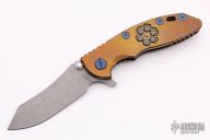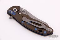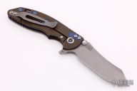 This XM-18 by Rick Hinderer features a working finished blade with notched thumbrest and flipper. The handle has a custom titanium front scale, battle bonze finished titanium frame, satin hardware, and a tip up or down reversible anodized titanium clip and filler tab, lanyard hole at the butt. Has a couple light scuffs, otherwise excellent condition. Comes with original box and extra pivot hardware.