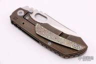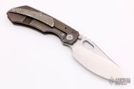This Evolution 2.0 by Custom Knife Factory features a hand rub satin finished blade with notched thumbrest and thumbhole. The handle has a textured titanium frame with bronze anodized and tumbled finish, zircuTi pivot collars and tip up clip. Comes with velcro case and COA. Nice detent, lockup and blade seating. Excellent condition. #325