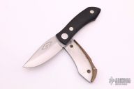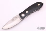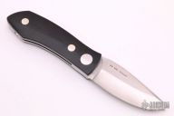 This Barry Wood swing lock folder features a satin finish blade and satin finish stainless steel frame with black linen micarta scales. This is a very unique scissor opening folder, which when the blade is fully open and locked in place is almost a fixed blade knife. The handle is nicely contoured for a comfortable grip. Opening is accomplished by lighting pressing down and outward at the rear indentation on the spine, which releases the locking pin and allows one side of the handle and the blade to rotate down then forward until the blade locks in the forward position. The one side of the handle continues to rotate back until it locks in place. Closing requires the same slight thumb pressure at the indentation to release the locking pin, then the one side of the handle is rotated back and around, catching the blade and aligning both with the other side of the handle in a locked closed position. Has some light scratches otherwise excellent condition. Comes with original tube and paper work.