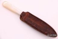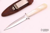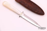 This Boot Knife by Pat Crawford features a mirror finished double edged blade with .177" blade stock and .715" blade depth, hidden tang construction. The handle has nickel silver guard and a beautiful mother of pearl grip. Comes with a brown leather sheath with a clip. Excellent condition. Made in 1979 and is #227