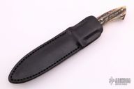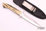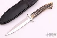 This Boot Knife by Pat Crawford features a mirror finished double edged blade with .174" blade stock and .780" blade depth, full tapered tang construction. The handle has nickel silver guard, stag scales grip with red liners. Comes with a black leather sheath with a clip. Excellent condition. Made in 1978 and is #39