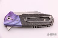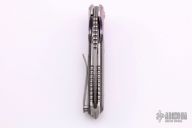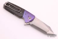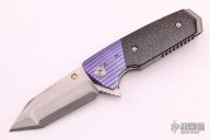 This Mini Tank Flipper from Allen Elishewitz features a two-tone tanto San Mai blade with notched thumbrest and flipper. The handle has laminated Mokuti bolsters, lighting strike carbon fiber scales, textured and anodized titanium liners, bead blasted steel backspacer and a matching tip up pocket clip. Nice detent, lockup and blade seating. Excellent Condition.