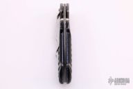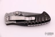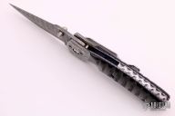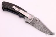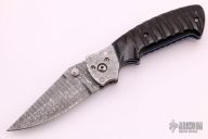 This Mini Kasper from Pat and Wes Crawford features a Damascus blade with false top edge and dual thumbstuds. Fully fileworked, jeweled, and blue anodized titanium liners, dovetailed Damascus bolsters, fileworked steel backspacer, and jigged black bone scales. Stainless steel clip with filework. Beautiful materials and workmanship.  Excellent Condition.