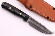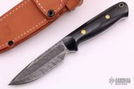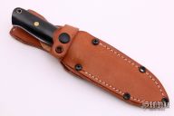This knife by Night Watch Knives features a "War Wash" finished spear point blade with fullers and custom acid etched finish, .193" blade stock and 1.102" blade depth, full tang construction. The handle has black linen micarta scales with brass pins and lanyard hole. Comes with a brown leather sheath. Excellent condition.