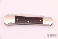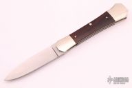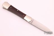 This Coffin Handle lockback folder by Mel Pardue features a satin finished drop point blade. The handle has nickel silver bolsters, front and rear, wood scales, nickel silver liners, stainless steel backspacer. Nice lockup. Has some patina and some light scratches, otherwise good condition. #036 on the blade.