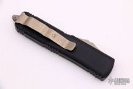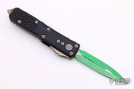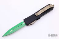 This UTX-85 OTF Automatic from Microtech features a green cerakoted double edged blade with fuller. The handle is comprised of a black aluminum tri grip frame iwth bronzed steel thumb slide, clip and glas breaker. Dated 04/2021 with a S/N of 5112. Includes original box and papers. Excellent condition.