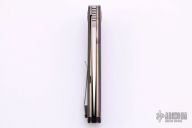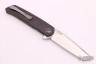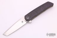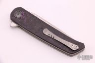 This A7 flipper by Andre Thorburn and Andre van Heerden features a hand rub satin finished tanto blade with swedge, notched thumbrest and flipper. The handle has black/purple fat carbon scales, anodized titanium liners, carbon fiber backspacer, bead blasted titanium tip up clip. Rides on ceramic IKBS. Includes velcro case and COA dated November 2020. Great blade seating, detent and lock up with a very smooth and fast flipping action. Excellent condition.