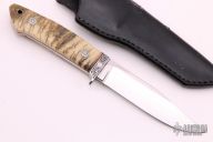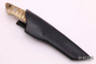 This hunter by Wayne Clay features a mirror polished blade with .180" blade stock and 1.088" blade depth, full tapered tang construction. The handle has an engraved stainless steel guard, sheep horn scales with red liners and engraved stainless steel pins. Comes with a black leather sheath. Has a small oxidation spot on the spine of the tang near the guard, otherwise excellent condition.