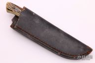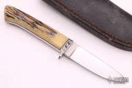 This Hunter by Tommy Lee features a mirror polished blade with .189" blade stock and .878" blade depth, full tapered tang construction. The handle has engraved stainless steel guard, stag scales with black liners and engraved stainless steel pins. Comes with a black leather sheath. Has a few light scratches, sheath is a little rough, otherwise excellent condition.
