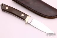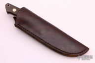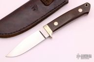 This Loveless Style Utility from John April features a polished clip point blade.  .198" Blade Stock. .944" Blade Depth. The handle has a nickel silver guard with brass pins and brown canvas micarta scales with nickel silver and steel pins and nickel silver lanyard tube over red liners and full tapered tang construction. Includes leather sheath with belt loop that is stamped #119.  Excellent Condition.