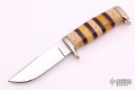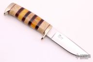 This My Knife by D'Alton Holder features a mirror polished drop point blade with .165" blade thickness and 1.083" blade depth, hidden tang construction. The handle has nickel silver guard and butt with a handle consisting of oosic, cocobolo and amber with a red and nickel silver spacers. Beautiful combination of materials and excellent workmanship. Excellent condition.
