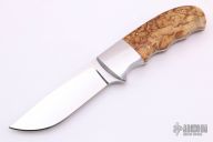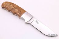 This Hunter by D'Alton Holder features a mirror polished blade with .165" blade stock and 1.035" blade depth, full tapered tang construction. The handle has stainless steel bolsters and burlwood scales with red liners. Has a couple light scratches, otherwise excellent condition.