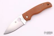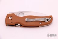 This Shaman Pin by Spyderco features a satin spear point REX 45 blade with notched thumb and finger rests, thumbhole. The handle has burnt orange G-10 scales, inlaid stainless steel liners and a black stainless steel backspacer, 4-way reversible stainless steel clip, lanyard hole at the butt. Comes with original box and papers. Excellent condition.