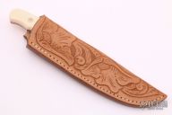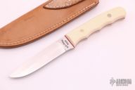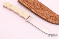 This hunter by Roger M Green features a hand rub satin finished blade with .125" blade stock and .841" blade depth, full tapered tang construction. The handle has ivorite scales with red liners and nickel silver and brass pins. Comes with a hand tooled brown leather sheath. New from maker at the 2021 ICCE Show.