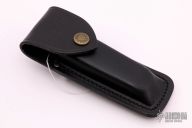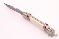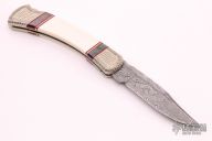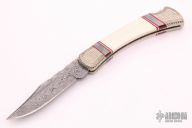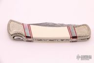 This knife features a Damasteel clip point blade with a file worked blade spine. The handle features textured nickel silver bolsters, red liners, pearl and mammoth scales. Includes a black leather sheath.