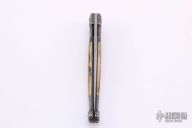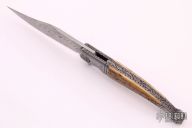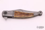 This knife by Gudy Van Poppel features a Damascus clip point blade with false top edge and flipper. The handle has dovetailed and fluted Damascus bolsters, beautiful mammoth ivory scales, carved dovetailed and fluted Damascus rear bolsters, fileworked rose gold screw surrounds, blasted and fileworked titanium liners and backspacer. Rides on bearings, nice detent, lockup and blade seating. The trough of the knife is tapered, very cool feature. Comes with zippered case. Excellent condition.