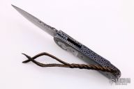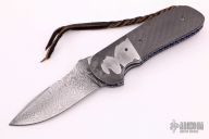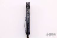 This Viper linerlock flipper by Mark Nevling features a Random Pattern Damascus blade (160 layers of 15n20 and 1084) with a flipper and file work on blade spine and flipper. 5 layer Random Pattern Damascus bolsters, carbon fiber scales, fileworked and anodized titanium liners, fileworked steel backspacer, and an anodized titanium clip positioned for tip up carry. Strong lock up, nice detent and blade seating is dead center. Comes with nylon zippered case, and COA dated 4/2/15. Excellent condition.