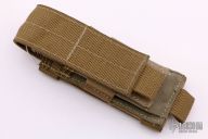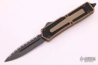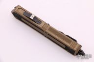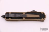 This Scarab OTF auto has a black double-edged blade with partial serrations.  The handle is tan aluminum with non-slip inserts, black hardware and a tip down black stainless steel clip. Has tritium vial in thumbslide. Dated 08/2009, S/N 00051.  Includes a tan nylon sheath.  There are a few light scratches on the frame otherwise the knife is in Excellent condition.