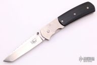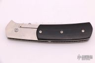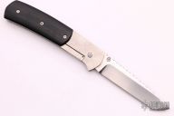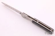 This liner lock by Mel Pardue features a hand rub satin finished tanto blade with fileworked spine and single thumbstud with black linen micarta inlay. The handle has black linen micarta scales, orange peel finished titanium frame with jeweled interiors. Nice detent, lockup and blade seating. Has a scratch on the frame, otherwise excellent condition. Comes with a zippered case.