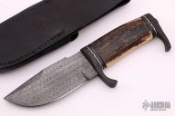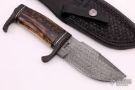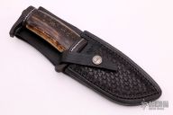 This Gill Hibben Style Elmer Keith knife by Jerry Rados and Cheryl Lambert features a clip point Rados Turkish Twist Damascus blade with false top edge, .196" blade stock and 1.852" blade depth, hidden tang construction. The handle has a Rados Turkish Twist Damascus guard, butt guard, fluted spacers and tang nut, fileworked nickel silver spacers as well and a beautiful stabilized fossil walrus ivory handle with beautiful colors. Comes with a hand tooled black leather sheath with a Gil Hibben button and is stamped on the back "Hibben Knives La Grange, KY". Excellent condition. Comes with zippered case. This piece is stunning.