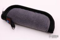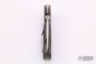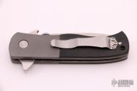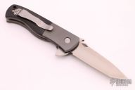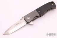 This Custom CQC-7 Flipper by Ernie Emerson features a satin finished chisel ground tanto blade with notched thumbrest, wave feature, thumbdisc and flipper. The handle has bead blasted and dovetailed titanium bolsters, black paper micarta scales, bead blasted titanium liners, lanyard hole, tip up stainless steel clip. Comes with nylon zippered case. Excellent condition.