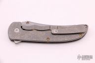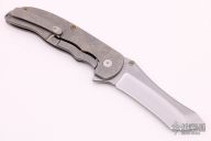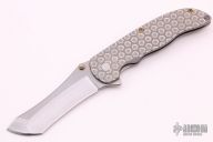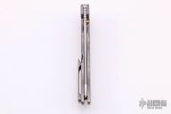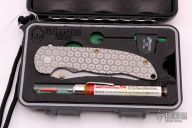 This Norseman (#2284) by John Grimsmo features a stonewashed blade with a single anodized titanium thumb stud, notched thumb ramp and flipper. Stonewashed titanium frame with a honeycomb pattern front scale and titanium screws. Very smooth action that requires no wrist movement. Nice detent, lockup and blade seating. Rides on ceramic bearings. Knife is in excellent condition, shows no signs of use or carry. Comes with original packaging, custom hard case, Nano-Oil, tool, and COA dated May 7, 2019