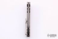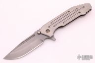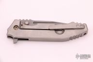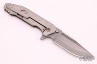 This Peter Rassenti Custom SNAFU integral framelock folder features a matte finished blade with flipper, notched thumbrest, fullers and dual thumb studs. The integral handle is orange peel finished titanium with a titanium clip positioned for tip up carry. Edges have been beveled. Very smooth action, blade is centered and has no play whatsoever when opened. Outstanding work from Peter. Has a few light scuffs, otherwise good condition.