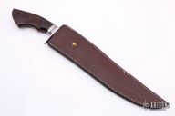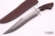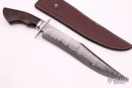 This Bowie/fighter by Journeyman Smith Kyle Gahagan (i believe this knife was made before he was a Journeyman Smith since it is not stamped JS) features a hand rub satin finished San Mai Damascus blade with a false top edge, .267" blade stock and 1.921" blade depth, hidden tang construction. The handle has a steel guard with a fluted copper spacer, desert ironwood burl grip, very comfortable in hand. Comes with a hand tooled brown leather sheath. Excellent condition.