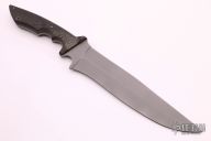 This Battle Bowie by the late Larry Harley features a bead blasted, double-edged blade with .235" blade stock and 2.033" blade depth, full tapered tang construction. The handle has nicely contoured black canvas micarta scales with a lanyard tube in pommel. Includes a zippered. Excellent condition.