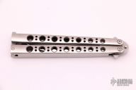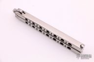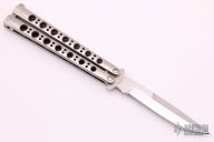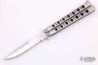 This Model 42 Balisong by Benchmade features a satin finished blade with swedge. The handle is comprised of integral skeletonized titanium handles with spring T latch on pommel. Comes with original box, sheath and papers. Excellent condition.
