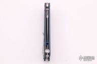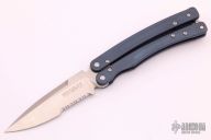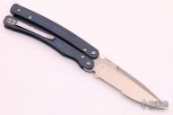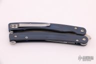 This Mayhen Balisong by Bradley Cutlery Company features a tumble finished drop point blade with swedge and notched thumb rest. The handle is comprised of anodized and bead blasted titanium frame with stainless steel tip up clip and spring-loaded T latch. Has a few light scuffs, otherwise excellent condition.