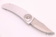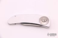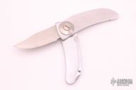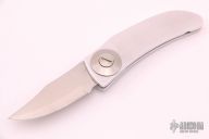 This Barry Wood Style Swinglock features a satin finished blade and satin finished aluminum handle. Comes with a cloth pouch. The blade says "Stainless steel Made in Italy". Has a few light scratches, otherwise excellent condition. (If you know who made these, please let us know)