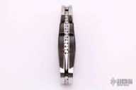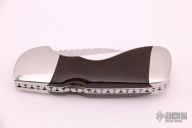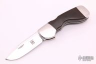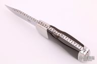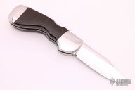 This knife by Rendon Griffin features a mirror polished clip point blade with fileworked spine and a nail nick. The handle has polished stainless steel dovetailed bolsters, front and rear, black linen micarta scales, fileworked stainless steel liner, and a fileworked stainless steel backspacer. Comes with a zippered case. Nice lockup and blade seating. Has a few light scratches, otherwise excellent condition.