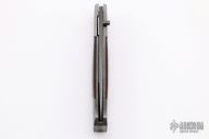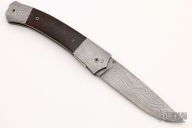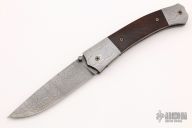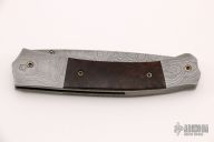 This knife by Ulrich Hennicke features a Damascus blade with a single Damascus thumbstud. The handle has Damascus bolsters with integral liners, wood inlays, Damascus backspacer, inlaid liner. Nice detent, lockup and blade seating. Has heat colored screws. Comes with a zippered case. Excellent condition.