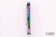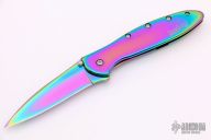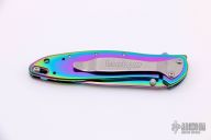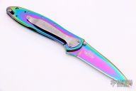 This Rainbow Leek Assisted Opening Framelock Flipper has a rainbow finished stainless steel drop point blade with dual thumb studs, flipper and notched thumbrest. Handle is rainbow finished stainless steel frame, with lanyard hole and safety lock. Stainless steel clip is tip up/ down reversible, RH carry. Excellent condition. Comes with original box, papers and zippered case.