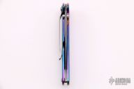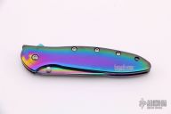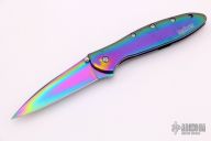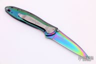 This Rainbow Leek Assisted Opening Framelock Flipper has a rainbow finished stainless steel drop point blade with dual thumb studs, flipper and notched thumbrest. Handle is rainbow finished stainless steel frame, with lanyard hole and safety lock. Stainless steel clip is tip up/ down reversible, RH carry. Excellent condition. Comes with original papers and zippered case.