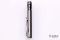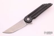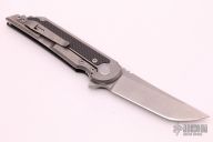This UHEP frame-lock flipper by Jake Hoback has a stonewashed upswept/tanto blade, notched thumbrest and flipper. CBP caged bearing pivot. Handle is carbon fiber and titanium with carbon fiber inlay on the lockside, stonewashed titanium tip up clip and backspacer, clip is reversible left or right. This knife has an adjustable detent. Nice detent, lockup, and blade seating, and flips like a boss. Knife is in excellent condition and shows no signs of use. Comes in original box with COA. Excellent condition.