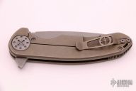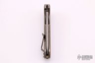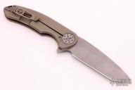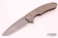 This Large F3 by Curtiss Knives features a stonewashed blade with notched thumbrest and flipper. The handle has an anodized and tumbled titanium frame with a matching tip up titanium clip. Blasted titanium hardware. Rides on bearings, nice detent and lockup. Comes with COA dated 3-28-17. Has some scuffs and scratches, otherwise good condition.