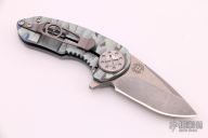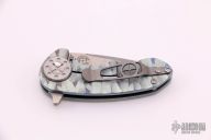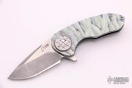 This compact F3 series flipper by Dave Curtiss features a tumble finished blade with a flipper. Textured and anodized titanium frame and pocket clip for tip up carry. Smooth and fast opening using the IKBS (Ikoma-Korth Bearing System). Has a couple light scratches, otherwise excellent condition. Nice detent, lockup and blade seating. Excellent Condition. Comes with a zippered case.