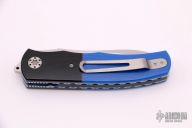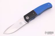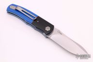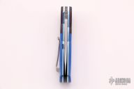 This Linerlock Front Flipper from Andre Thorburn features a hand rubbed satin finish blade with notched thumbrest and flipper. The handle has black G-10 bolsters, blue G-10 scales, anodized and fileworked titanium liners, a satin titanium clip, tip up carry, black G-10 backspacer. Features IKBS. Nice detent, lockup and blade seating. Has some scratches, otherwise good condition. Comes with zippered case.