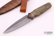 This Dagger by Anders Hogstrom features a double-edged 1050 blade with beautiful hamon, .242" blade stock and 1.228" blade depth, hidden tang construction. The handle has a textured copper guard, beautiful super gloss finished Beech Burl wood grip. Comes with a hand tooled leather sheath and a velcro case. New from maker.