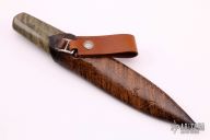 "I make mostly daggers, fighters and what I call “Kwaikens” but also swords and folding knives. I primarily use 1050 carbon spring steel and damascus of various compositions and on occasion, stainless steel for the blades. For the 1050 I employ a clay “tempering” technique that gives the blade a beautiful temper line (hamon) as well as a hard edge while maintaining a flexible core of the blade. These blades are rough ground and then finished off by hand with files and sandpaper before the final stage of etching the blade to bring out the hamon. When it comes to damascus, I tend to lean towards a simpler random or a twist pattern that goes with the overall simplistic scheme of my knives. These blades are worked and finished in a similar fashion as the carbon steel ones. I use stainless steel, mostly Damasteel stainless damascus, for folders, art knives ( for ex. Skull Cleaver and Druid Sickle) and some full-tang dress-knives, my Tuxer model, or upscale hunting/skinning-knives. For the handles and wooden sheaths I use rare exotic hardwoods, ancient ivories and bone material from all over the world. Even large pieces of natural amber has found its way onto a couple of my knives. A few wood favorites are Snakewood for its amazing striped grain pattern, Masur birch, Eucalyptus , and Redwood burl for its sometimes silky appearance."