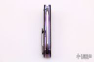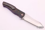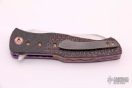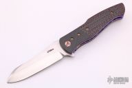 This RFK Flipper by Sean O'Hare features a hand rub satin finished blade with notched thumbrest and flipper. The handle has carbon fiber bolsters, silver lightning strike carbon fiber scales, anodized titanium liners with jeweled interiors, bead blasted titanium clip, tip up carry, anodized titanium screws, fileworked and anodized titanium backspacer. Nice detent, lockup and blade seating, rides on bearings. Excellent condition. Comes with a zippered case and COA.