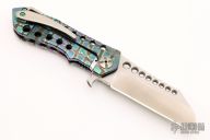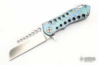 This Moab by Darrel Ralph features a satin finished wharncliffe style blade with flipper and fileworked spine. The handle is comprised of a flame finished and drilled titanium frame, backspacer with lanyard bail, and tip up clip. Nice detent, lockup and blade seating. Has a few light scratches, otherwise excellent condition. Includes original zippered case and COA dated 8/18.