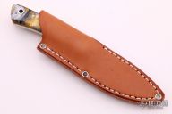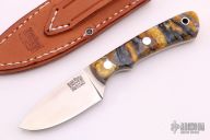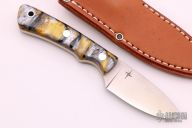 This PSK EDC from Bark River features a satin finished blade with .123" blade thickness and 1.070" blade depth, full tang construction. The handle has "Gold Rush" acrylic scales with yellow liners, aluminum pins and lanyard hole. Comes with a brown leather sheath and original box. Light scratches are visible on the blade otherwise the knife is in Excellent condition.