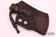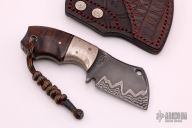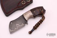 This Mini Cleaver by Zane Burch features a Damascus Core San Mai blade with notched thumbrest, .202" blade stock and 1.501" blade depth, full tang construction. The handle has mokume bolsters (forged by Zane Burch) Australian Ringed Gidgee (Acacia) scales with copper pins, black/red micarta spacers/liners, nickel silver lanyard hole. Comes with a hand tooled brown leather sheath with alligator skin overlay. Comes with original box and COA. Excellent condition.