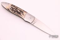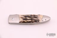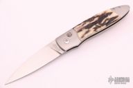 This BBQ Auto by Steve Jernigan features a hand rubbed satin finish drop point blade. Handle has a satin finished stainless steel frame with stag inlays, stainless backspacer. Nice lockup, action and blade seating. Has a ding in the handle spine, otherwise excellent condition.  Comes with a zippered case.