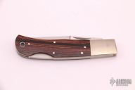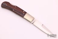 This stunning lockback folder by the late Jess Horn features a hand rubbed satin finished clip point blade with false top edge and nail nick. The handle has nickel silver bolsters with beautiful cocobolo scales, hand peened stainless steel pins, and nickel silver liners. Satin finished stainless steel backspacer, black linen micarta spacer at the butt, and butt of handle has lanyard hole. All the lines of this knife line up perfectly. It is a truly beautiful knife. Numbered 083. Flush lockup and nice blade seating. Excellent condition.