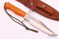This Buxton Fighter by Randall Made Knives has a satin finished blade with sharpened clip, .218" blade stock and 1.438" blade depth, full tang construction. The handle has a nickel silver guard, orange G-10 border patrol style handle. Comes with brown leather sheath. "BF 914" on blade. Excellent condition.