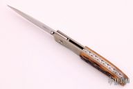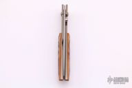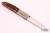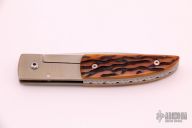 This liner lock by Mel Pardue features a hand rub satin finished blade with a single thumbstud. The handle has jigged bone scales, anodized and orange peel finished titanium frame with a fileworked stainless steel backspacer. Nice detent, lockup and blade seating. Excellent condition.